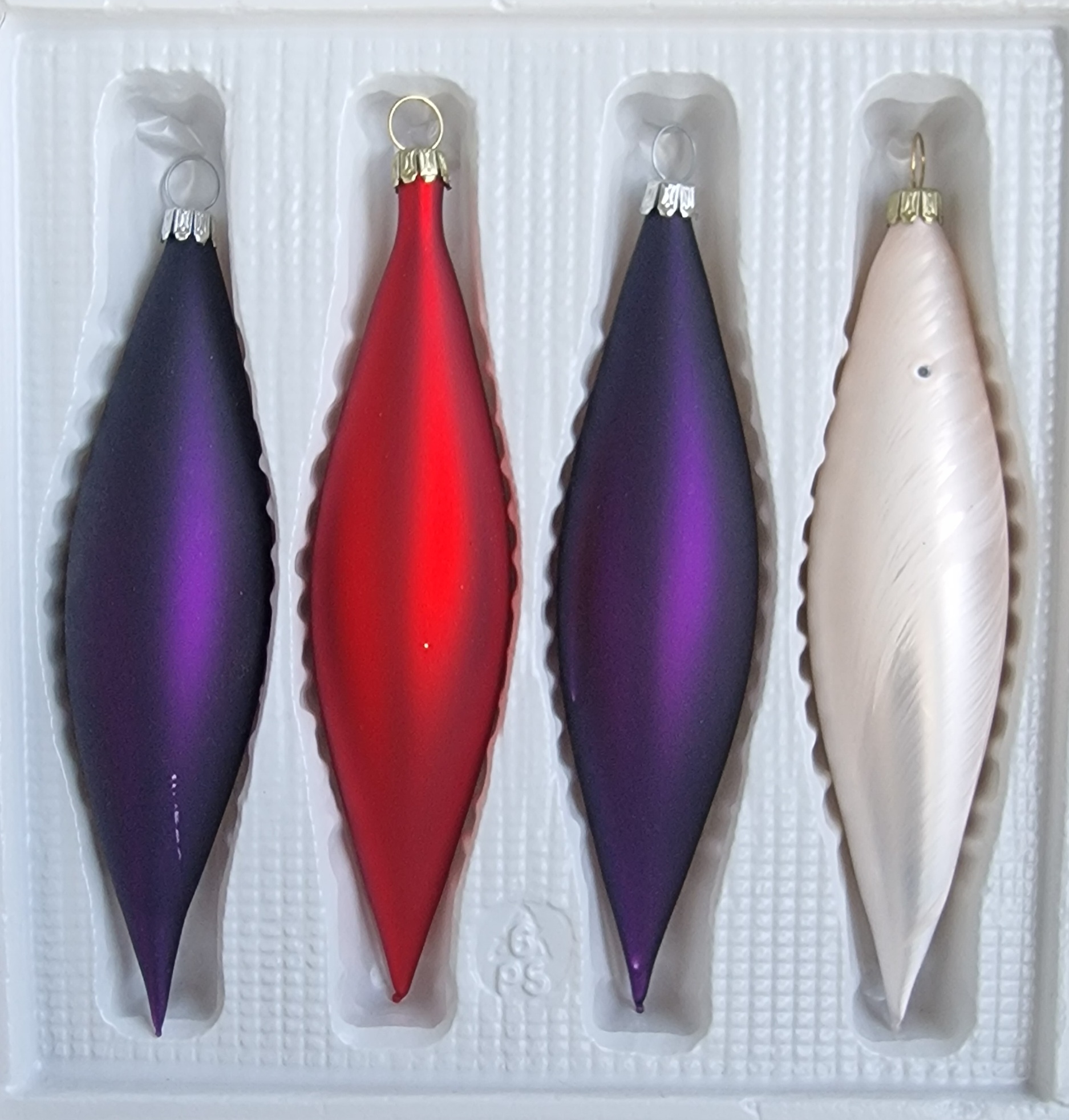 Oliven, 2 lila matt,1 rot matt,1 Eislack champagner,L 14cm, 2. Wahl